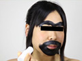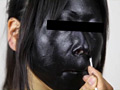今作では、スティックファンデーションを使用し、全身を真っ黒にしていきます。まずはまゆげを太く塗っていき、つなげて、次は口周り。ドロボウさんのできあがり!!楽しんでますね!!そのまま顔全体を塗っていき、綿棒で細かいところも塗れば顔は完成!!そして耳、身体と全身真っ黒に塗っていきます。