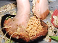 ケーキ、野菜、果物、弁当、シュークリーム、ソーセージ、豆腐など。色んな食べ物を次々とヒールやパンプス、生足で踏み潰しちゃいます。
