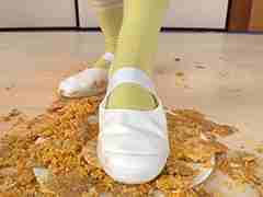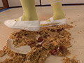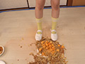 【本日のメニュー】ポテチ、ハンバーガー、こってりチーズ味パフ菓子、おせんべい、ぶどう、パン、クリームパン、マシュマロ、やきそばパン、アップルパイ。体育祭で、仮装しよ!で、集合準備をしていたあかねちゃん。あ!!!やだー、どうしよう!踏んじゃった!!!…けど…、けど。楽しいかも~!ポテチのクラッシュの音が癖になるって、ガスマスクを被りながらも、両足でジャンピングクラッシュ!!あかねちゃん、音を追求してくれますよ。一気にバリバリのパリパリ。雪の日の通学路を思い出させる音。固いものを投入して、音を楽しんだあとは、ぶどうを入れてしっとりと。生地がまとまったところで、上履き脱いでみよう!!ソックスでクラッシュにとりかかるあかねちゃん。ガスマスク越しのアニメ声で、とっても楽しそうにクラッシュしてる。マシュマロ、潰れなくてつまんなーい。黄色のソックスが、ベッタリと染みてきて…すっかり夢中になっちゃった!ヤバイ、ヤバイ、みんな待ってるし、このまま、寄せてっと。えへへ。楽しかったー。
