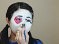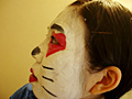 一人目の女の子は、化粧をあまりした事が無いと言う女の子。恥ずかしいメイクをしてみたかった☆と言う事で白塗りピエロメイクを自分でしてもらっちゃいました。化粧慣れしていないせいもあってぎこちない感じもありますが、初々しさが勝ってグッド。途中、蛍光塗料を塗ってもらい、顔面を光らせてみる予定でしたが…光らずに失敗。でもその素顔が可愛かったので収録しました。最後にはドリンクを飲むシーンやソーセージをちょっぴり大人っぽく頬張ったりしてくれました。二人目の女の子はドーランで顔面真っ黒になってしまいます。お化粧をする要領で黒ドーランを顔面へ塗り広げて行く女の子。段々真っ黒になりますが足立監督は容赦しない。ドーランを直に塗って行こうと指示。あっという間に本当の真っ黒な顔面の女の子が出来あがり。こちらの女の子にもドリンクを飲んでもらい、ソーセージを大人っぽく食べてもらいました。