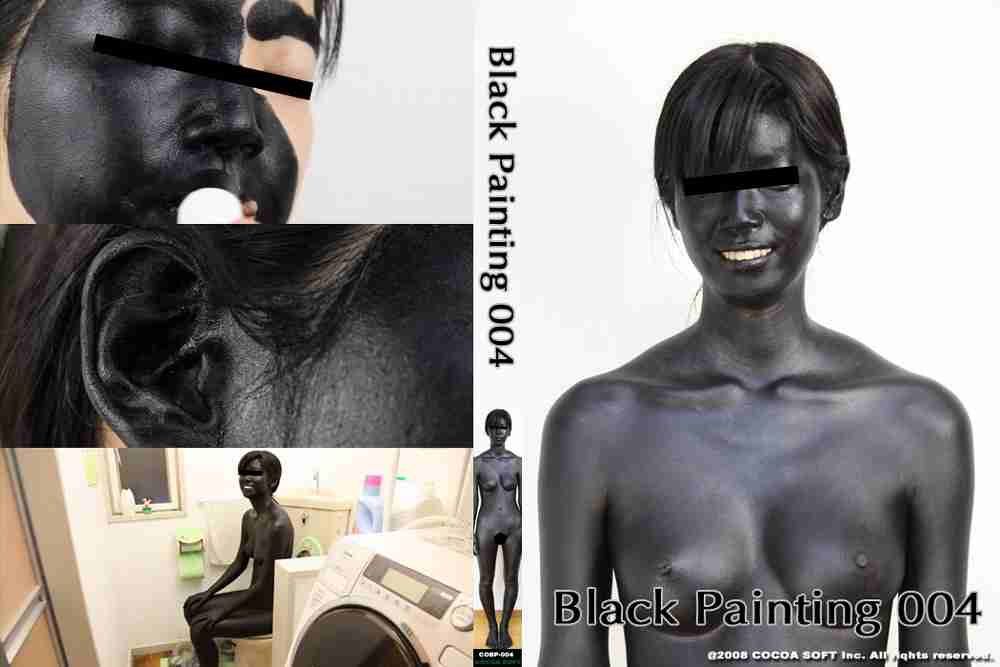 スティックファンデーションを使用し、全身を真っ黒にした作品です。すっぴん女性の顔から真っ黒に塗っていきます。耳の表面も真っ黒です。その後は、首、胸、両手、お腹、足…と全身が真っ黒になった女性は、目の白さが際立ち、ギョロ○とした表情を見せてくれます。 ※本編顔出し