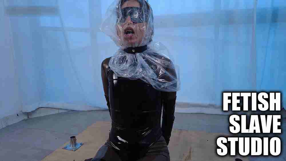 今度は垂直に伸びる鉄棒の前に座る形で固定されたヨーヨー。タイトなエナメルコスチュームがより肉に食い込んでいるように見えます。一見楽そうに見える座った形での調○だが、両足首・両腿・首と両手首という可動域がとことん固定され、予想以上の苦痛が彼女を襲う。その状態からさらに、マスターは非情にも頭にビニール袋をかぶせ…。