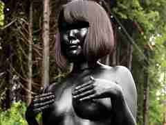 スティックファンデーションを使用し、全身を真っ黒にした作品です。すっぴん女性の顔から真っ黒に塗っていきます。耳の表面も真っ黒です。その後は、首、胸、両手、お腹、足…と全身が真っ黒になった女性は、目の白さが際立ち、ギョロ○とした表情を見せてくれます。 ※本編顔出し