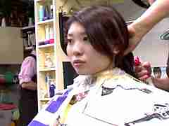 緊張しながら床屋さんに向かう女性。「坊主にして下さい。」と店主に伝え、着々と準備は進められていきます。霧吹きで髪をまとめ顎のラインまでカットしていきます。それから耳が出るように短くカットしていきます。ショートヘアを堪能した後更に…